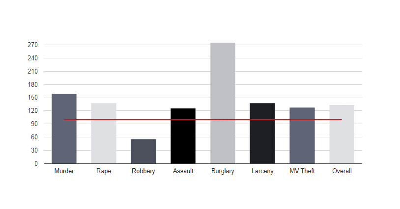 ​​​​​​​The national average for each type of crime equals a score of 100.